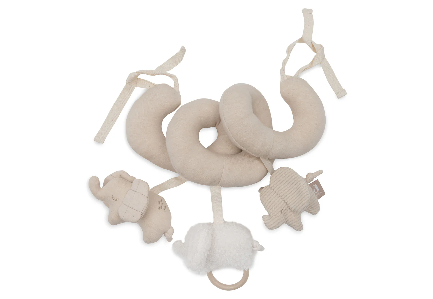 Ova mekana i razigrana spiralna igračka pruža zabavu i poticaj za razvoj bebine motorike i osjetila. Sadrži različite elemente poput šuškavih materijala, zrcala i zvučne igračkice, koji potiču istraživanje, hvatanje i slušanje. Spiralni oblik omogućuje jednostavno pričvršćivanje na krevetić, autosjedalicu ili kolica pomoću praktičnih vezica s obje strane. Idealna je za zabavu u pokretu, ali i kod kuće, dok istovremeno doprinosi ranom razvoju djeteta. Igračka je izrađena od sigurnih materijala.