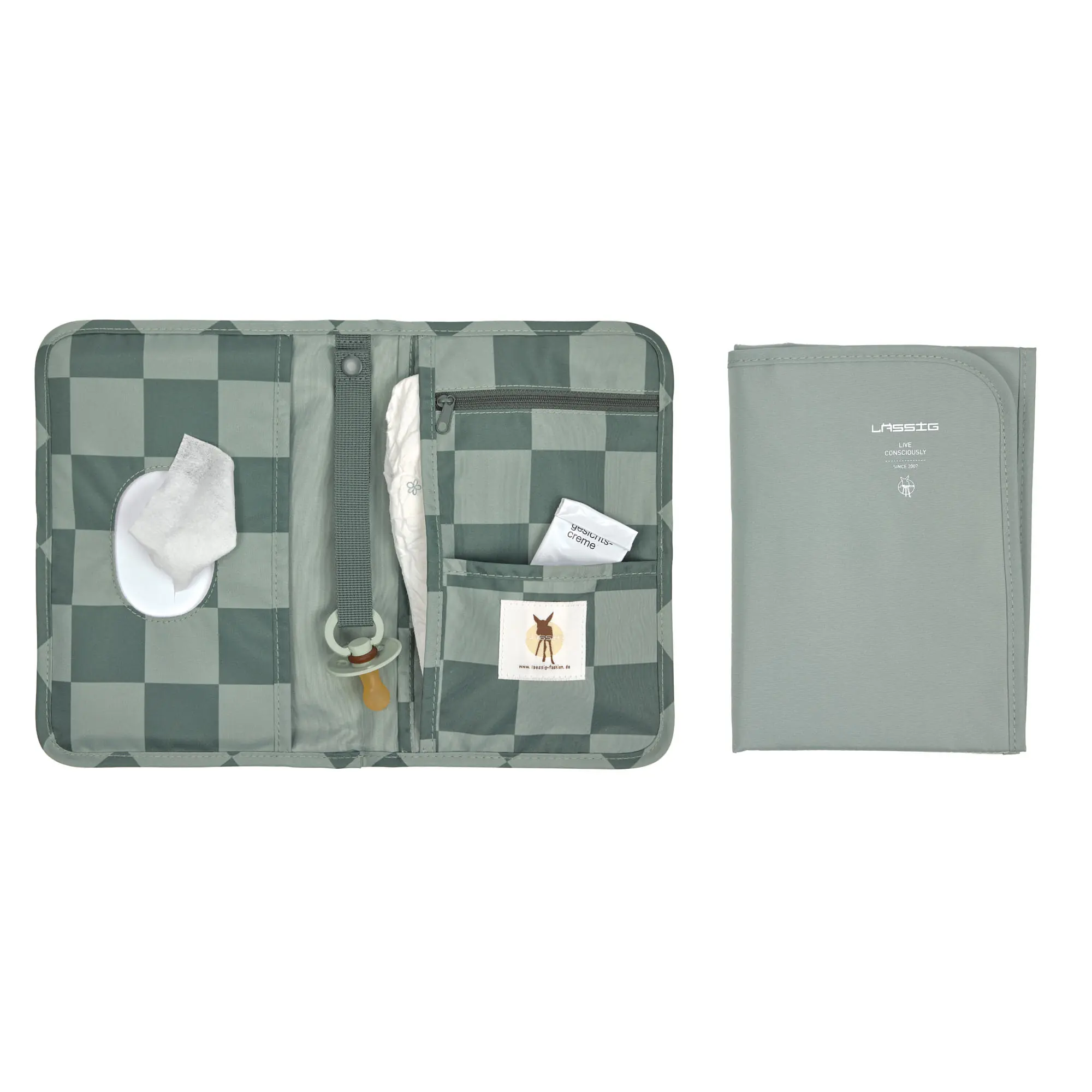 LÄSSIG torbica za prematanje, uz priloženu podlogu, idealno je rješenje za spremanje svih pribora potrebnih za prematanje pelena na kompaktnom i praktičnom mjestu. Svestrana i prikladna za bilo koju torbu, ova torbica ima više džepova za pelene, vlažne maramice i ostale predmete potrebne za njegu djeteta, tako da su sve neophodne stvari na dohvat ruke za brzu i jednostavnu promjenu pelena.